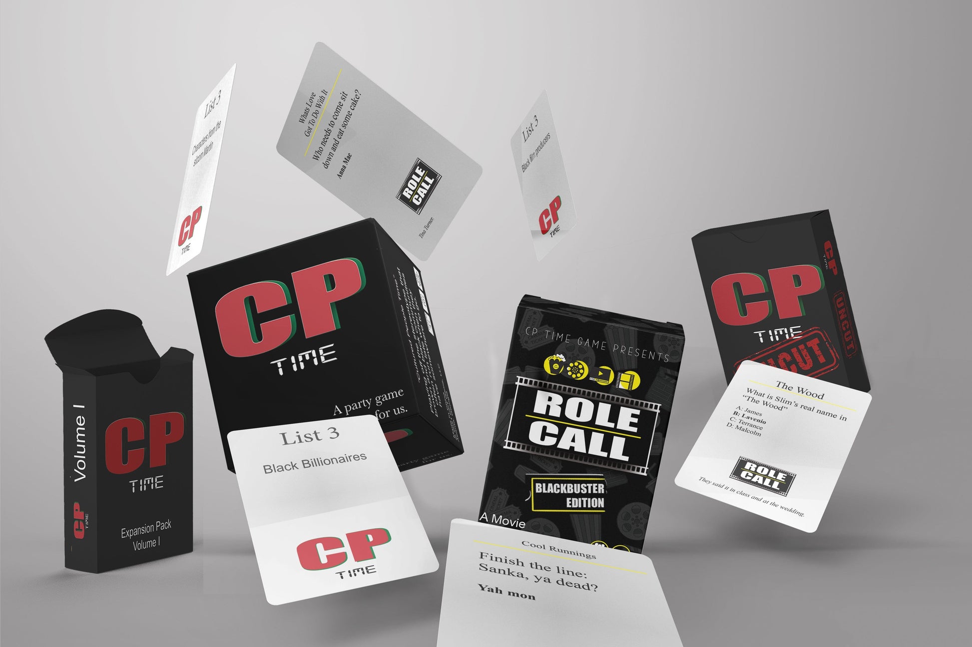 Elevate your game night to new heights with the ultimate CP Time Game Bundle. This bundle combines the best of Black culture and cinematic trivia with CP Time Original, two fantastic expansion packs - "Volume 1" and the daring "Uncut Edition," plus the cinephile's dream, Role Call: Blackbuster Edition. Whether you're a pop culture guru or a movie buff, this bundle guarantees endless hours of laughter and entertainment!